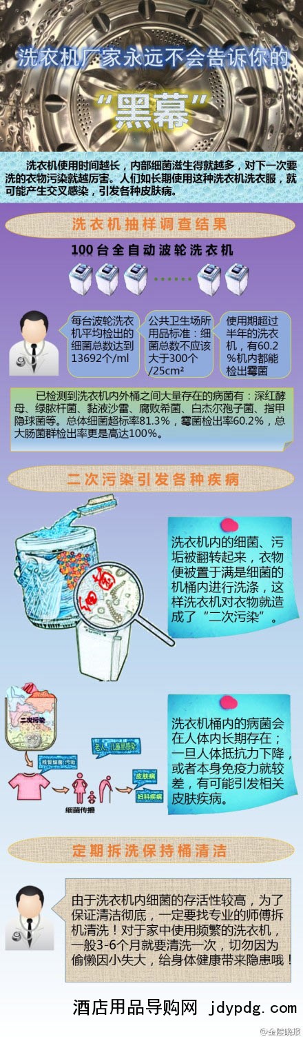 脏洗衣机怎能洗出干净的衣服?微博中也提到,洗衣机使用时间越长,内部细菌滋生得就越多,当下一次洗衣服时,洗衣机内的细菌、污垢就会被翻转起来,衣物便被置于满是细菌的机桶内进行洗涤,这样就造成了“二次污染”。并且,洗衣机内桶槽内的病菌长期潜伏在人体内,如果长期用这种洗衣机洗衣服,就可能产生交叉感染;一旦人体抵抗力下降,或者对本身免疫力就较差的老人和儿童而言,就有可能引发皮肤病、妇科疾病等相关疾病。